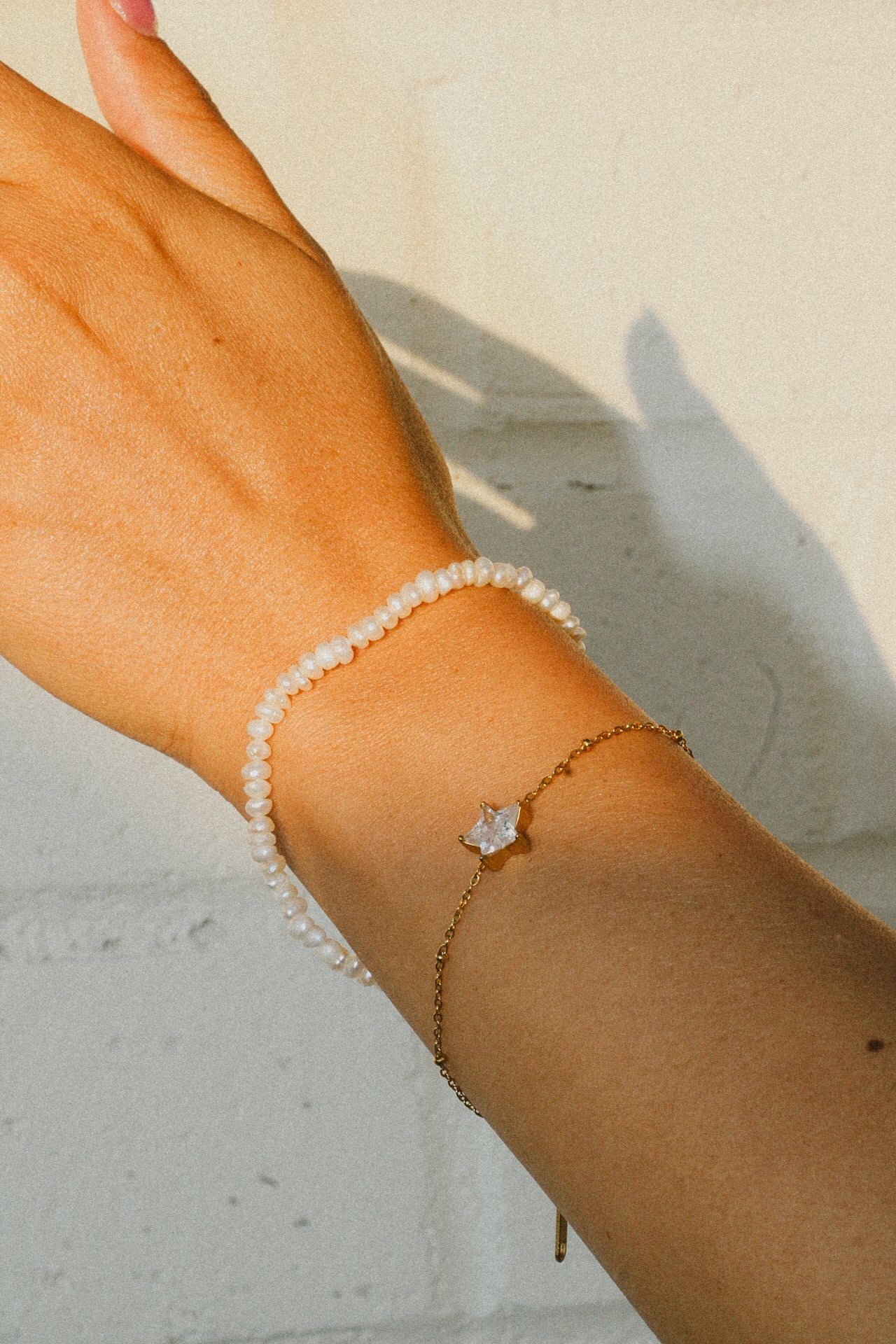 Playful, radiant, and effortlessly elegant, the Frankie Bracelet is crafted with 18k gold plating, its delicate chain featuring tiny, spaced gold beads that add a touch of refined charm. At its center, a brilliant zirconia crystal star twinkles with a celestial glow, symbolizing the joy and energy that makes Frankie so special.