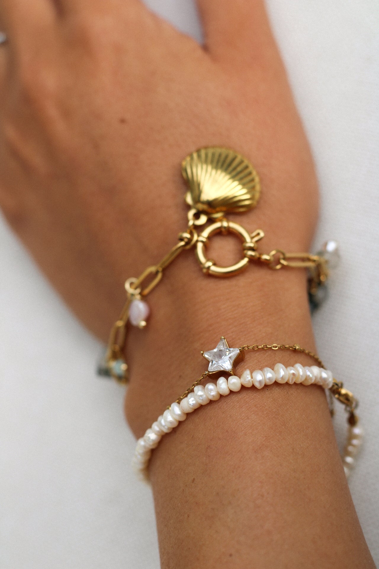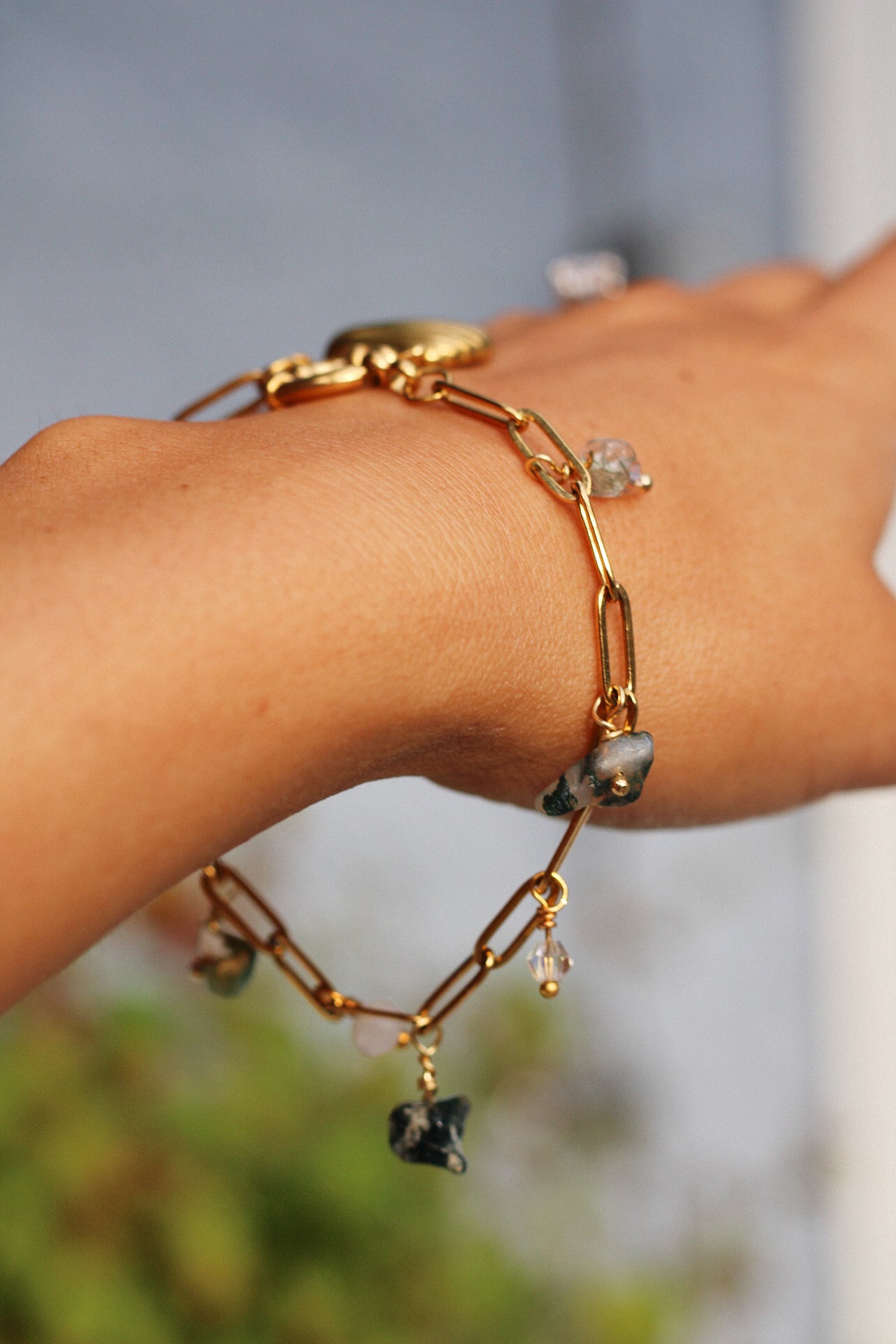 The Lynn Bracelet is a handmade charm bracelet combining natural stones — including crystals, pearls, and quartz — with a delicate shell charm. Crafted with 18k gold-plated stainless steel and an adjustable design, it balances natural texture with subtle shine. Each element is thoughtfully arranged, creating a versatile piece that works as a layered accessory or a standalone statement.