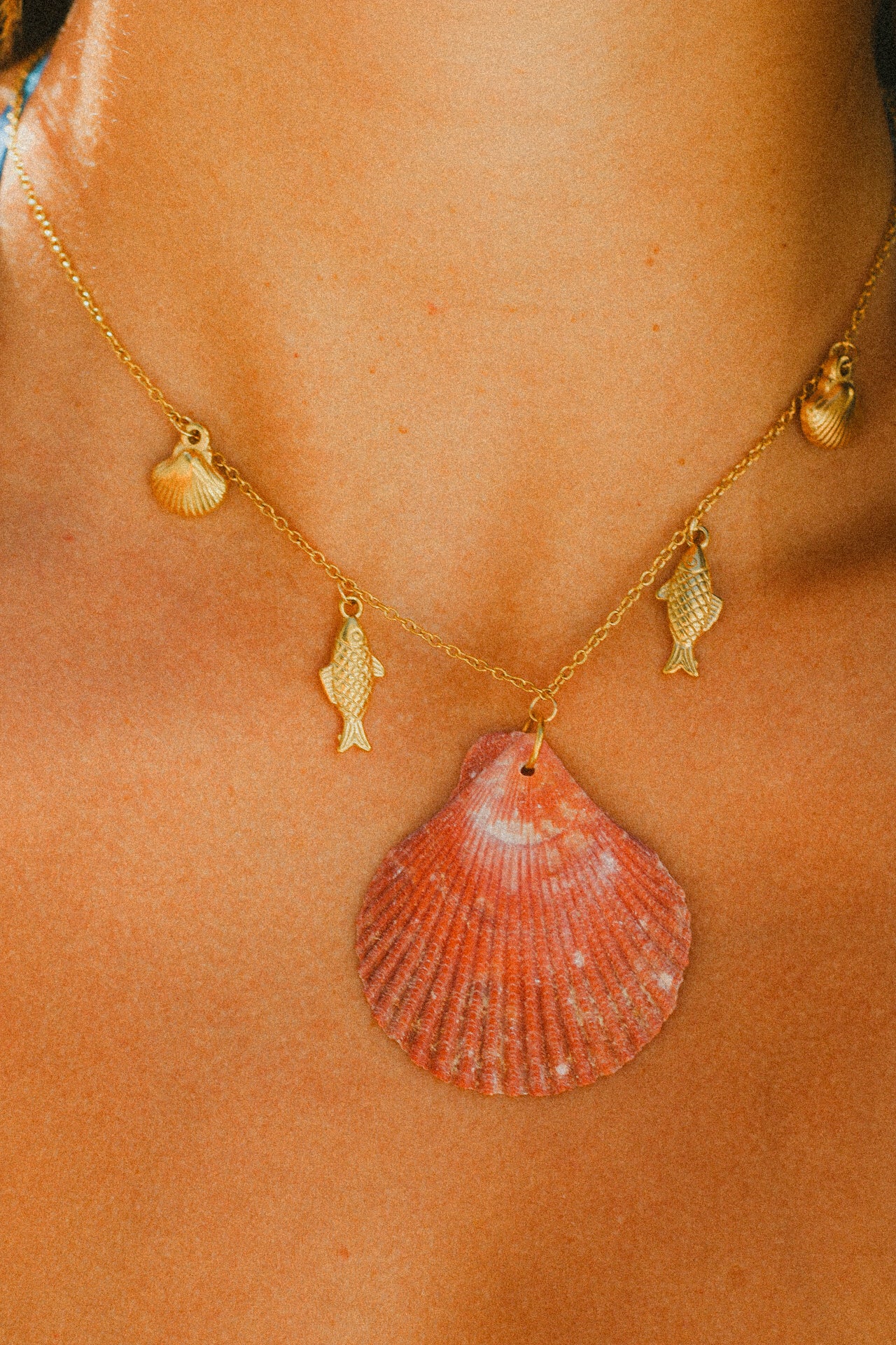 Dive into ocean-inspired elegance with the Marina Necklace. Featuring charming fish and shell motifs alongside a natural shell, each piece is completely unique—variations in the shell make every necklace one-of-a-kind. Crafted on a durable stainless steel chain plated in 18k gold, this adjustable necklace combines seaside charm with sophisticated wearability.