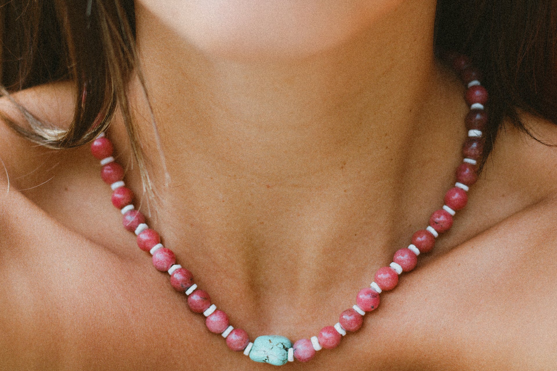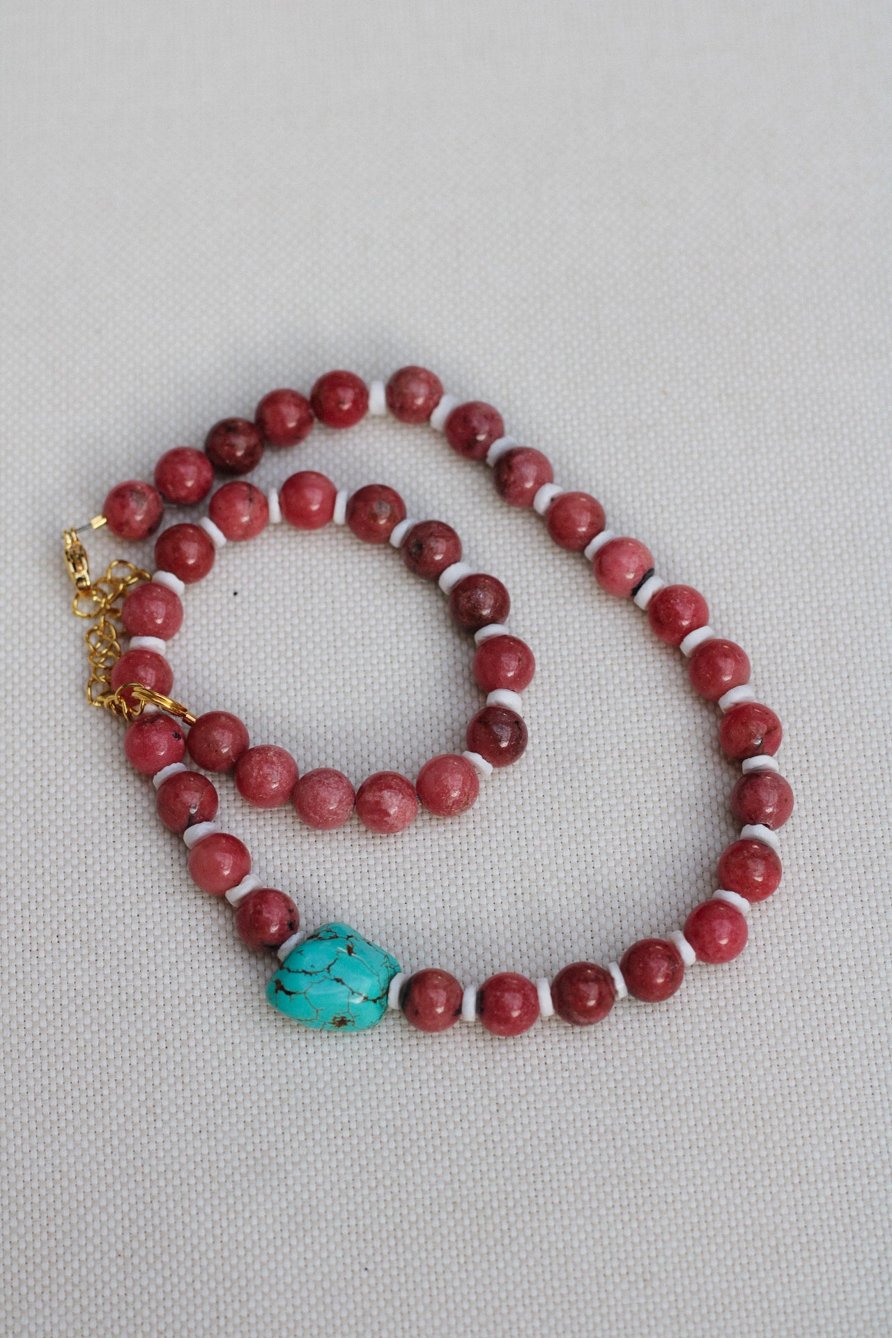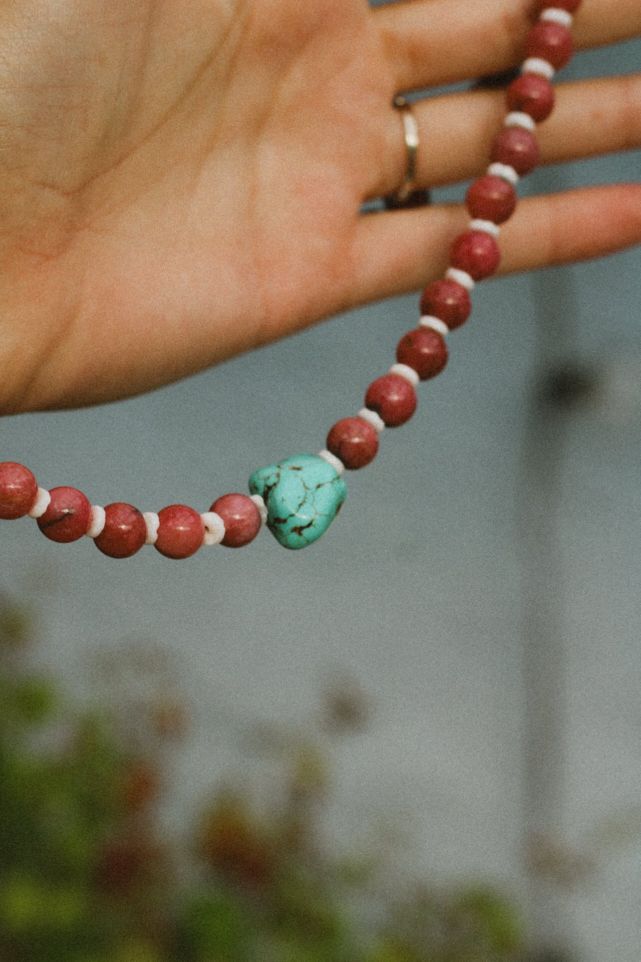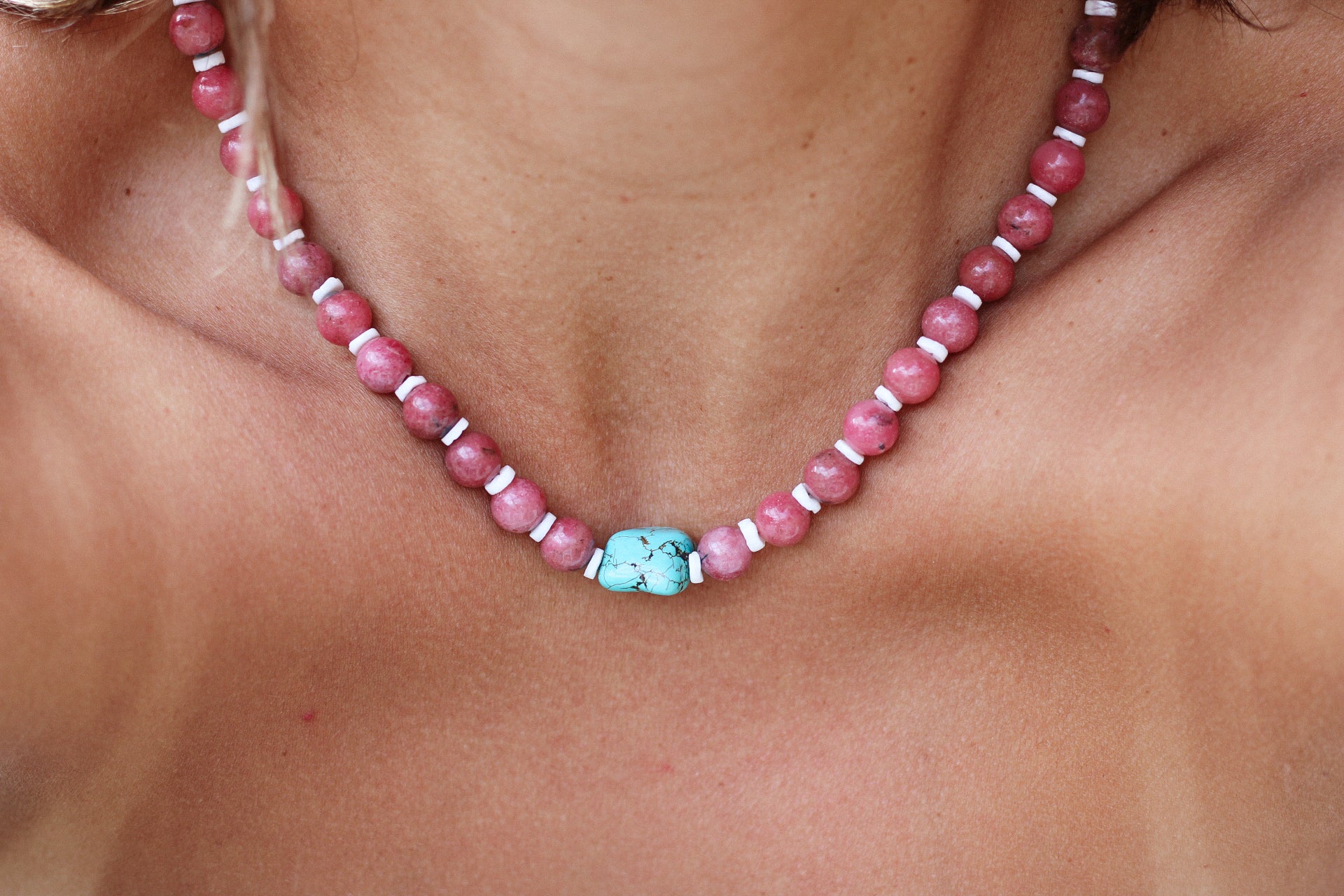 Named after one of my radiant students whose warmth and confidence inspires her siblings, The Sienna Necklace captures a spirit that is both joyful and strong. Crafted with beautiful pink stones and crisp white shell spacers, this piece balances playful color with elegant detail. At its center rests a striking turquoise stone — a symbol of calm, creativity, and self-expression. With an adjustable length for effortless versatility, The Sienna embodies the charm and individuality of the bright young woman who inspired it.