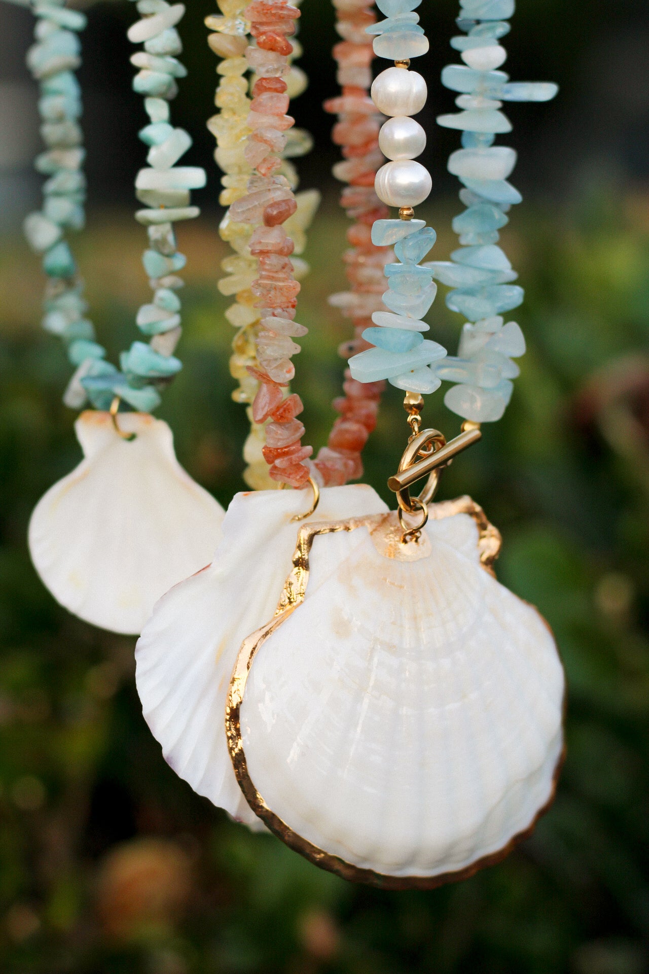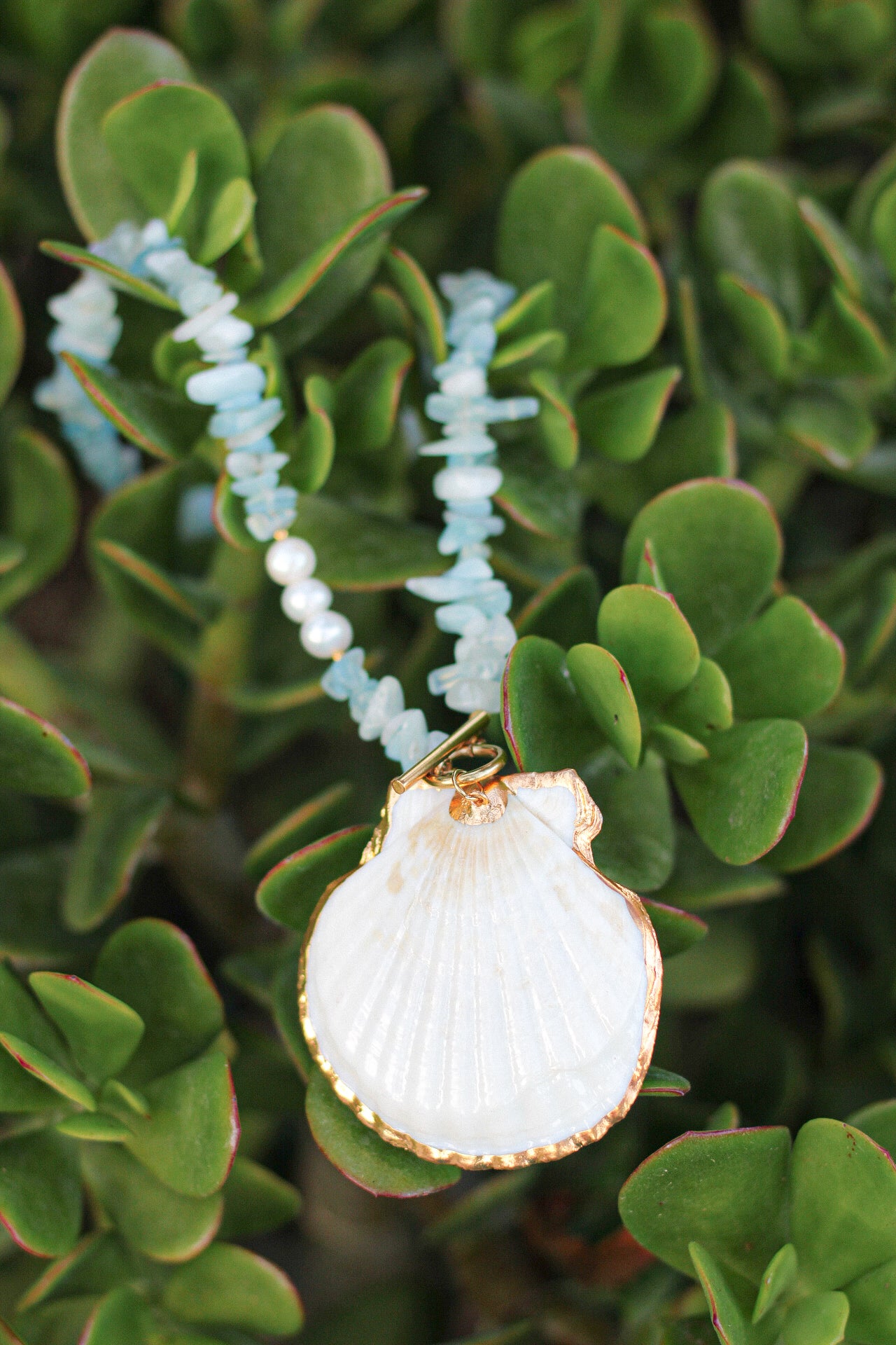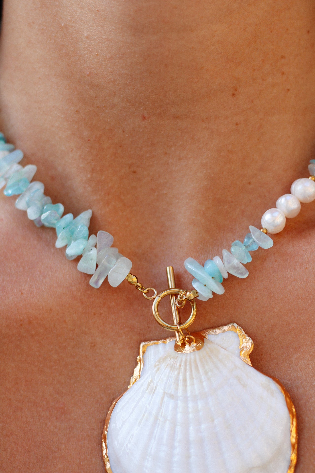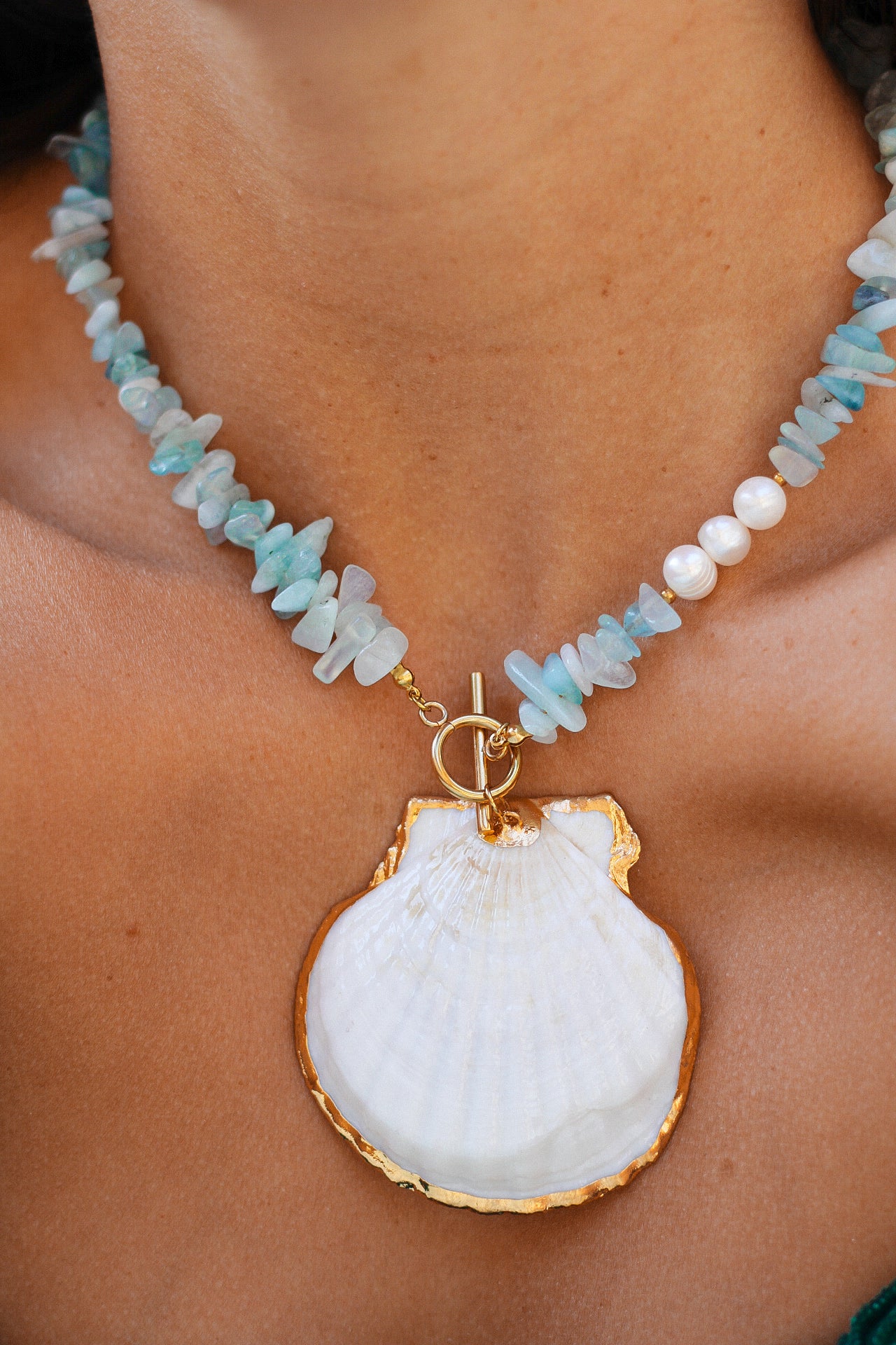 The Solana necklace captures the beauty of light and sea in one striking piece. At its heart rests a natural shell, delicately rimmed in gold, glowing with timeless refinement.